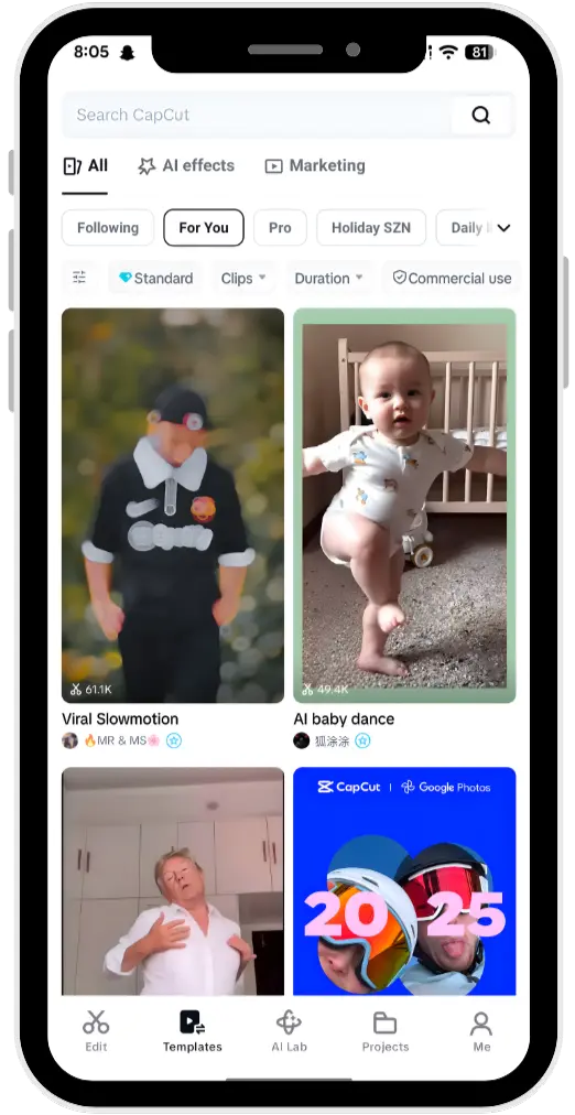 - Ready-Made Templates: New users can select stylish templates and just add their photos or clips. The app automatically applies effects, transitions, and music to create attractive videos quickly.